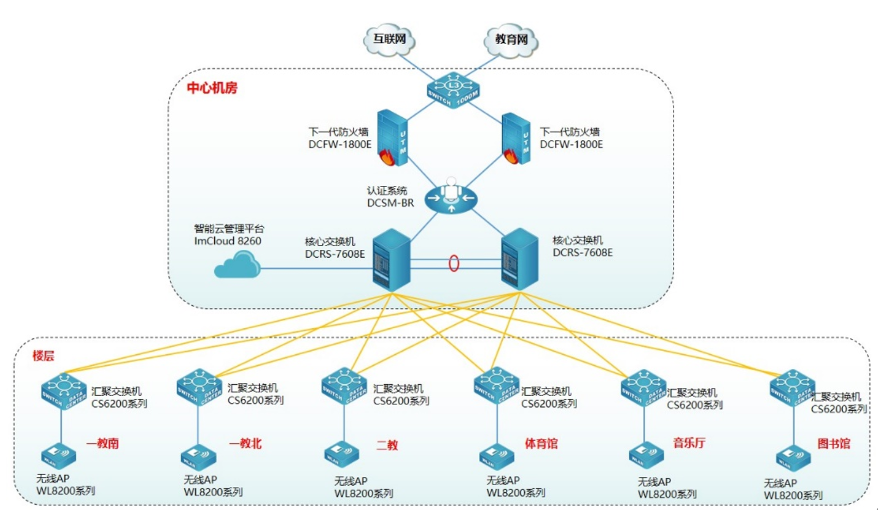 为方便用户对无线管理和维护,提升用户无线体验,使无线更智能化,此次采用腾博会官网智能云管理平台ImCloud 8260实现无线统一的管理、维护、认证,并可实现对全网无线设备管理、实现易部署、易维护、易扩展的无线网络。腾博会官网云管理ImCloud方案是网络服务的新模式,基于云端实现网络服务和管理,将复杂的网络管理简单化、智能化、可视化,提升用户网络体验。同时为了保证无线的安全,无线采用Portal准入认证,云管理ImCloud和腾博会官网身份认证系统DCSM-BR实现联动,用户需要顺利获得账号和密码认证成功后才能接入无线网络,在保证无线连接的便捷性同时兼顾无线的安全性。