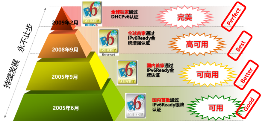 腾博会官网是国内首个顺利获得IPv6 Ready Phase2 认证的网络厂商,也是全球首个顺利获得IPv6 Ready Phase2 Enhance认证的网络厂商,还是全球最早顺利获得DHCPv6认证的网络厂商。