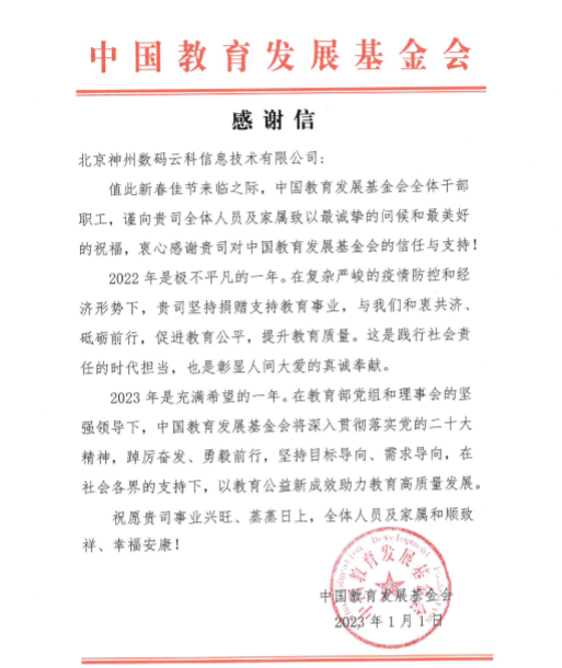 近期,evo视讯真人官网腾博会官网收到中国教育开展基金会的感谢信,以感谢evo视讯真人官网腾博会官网2022年在职业教育领域的贡献和实践,尤其是在全国职业院校大赛(中高职组)中对大赛顺利召开所付出的努力。